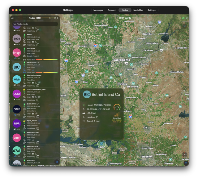 It makes sense that I can see others nearly 100 miles out, as the connections between nodes is line of sight, then extended by connections and the relaying of data node to node within the mesh network. So looking across a flat valley to join distant nodes, then connecting with others in the mesh around the bay makes for a rather healthy spread.